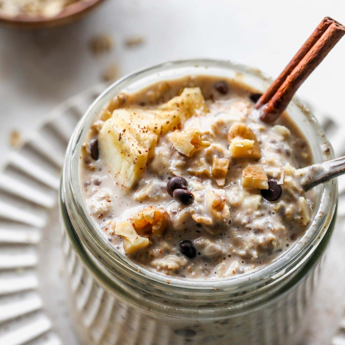 oats, chia seeds, oat, milk, maple syrup, vanilla, bananas, cinnamon. topped with pecans and dairy free chocolate chips, toasted coconut